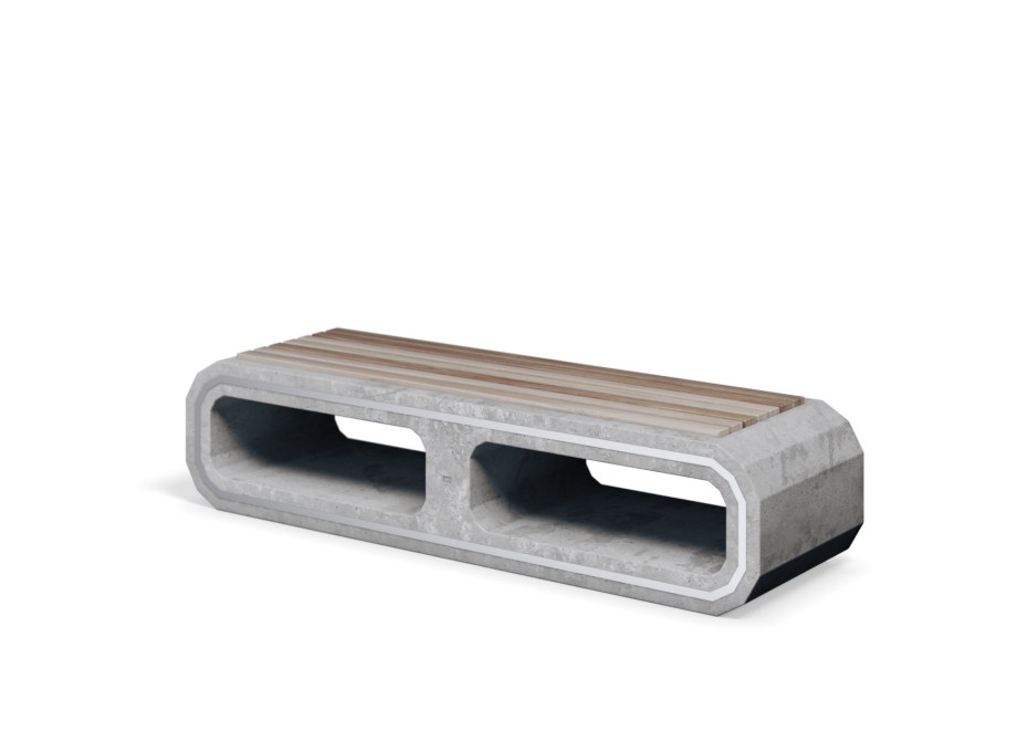 The Tulum concrete bench features an original design combined with thermowood elements for added comfort.